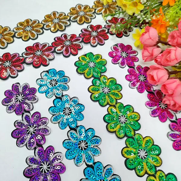 ອຸປະກອນເຄື່ອງນຸ່ງຫົ່ມເຄື່ອງນຸ່ງຫົ່ມ sequins lace ທີ່ມີກາວຫລັງແມ່ນມີຢູ່ໃນຫລາຍສີ, ຮູບແບບແລະຄວາມກວ້າງ. glitter ຕົວມັນເອງສາມາດແຕກຕ່າງກັນໃນຂະຫນາດ, ຮູບຮ່າງ, ແລະສໍາເລັດຮູບ. Gluing Backing ເຮັດໃຫ້ແອັບພລິເຄຊັນຂ້ອນຂ້າງງ່າຍດາຍ, ແຕ່ວ່າການຫຍິບມັກຈະແນະນໍາໃຫ້ໃຊ້ສໍາລັບຄວາມທົນທານທີ່ເພີ່ມຂື້ນ. sequins ແມ່ນຖືກອອກແບບມາເພື່ອຈັບແລະສະທ້ອນແສງສະຫວ່າງ, ສ້າງຜົນກະທົບທີ່ງົດງາມ.